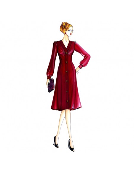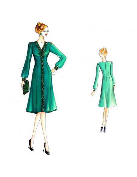 Redingote chemisier in crepe or satin, with an applied border in the same fabric or in lace and shirt sleeves gathered at the shoulders.