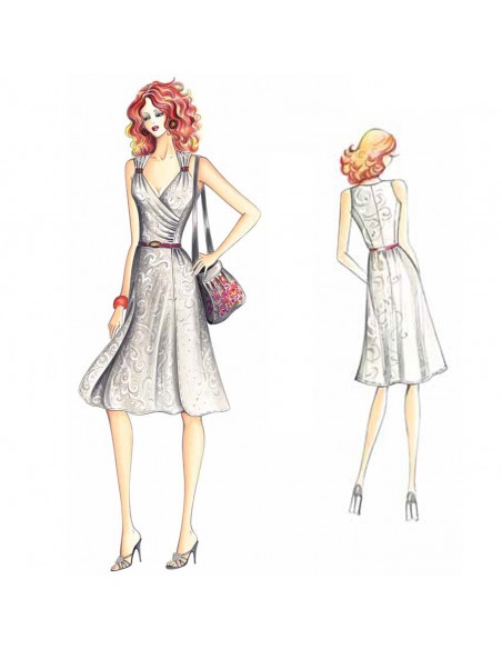 This 1950’s style dress has a draped bodice, sweetheart neckline that creates draping secured with by rings. The gored skirt is made of overlapping panels with rounded at the bottom slits. Suggested fabric: batiste or cotton muslin.