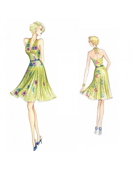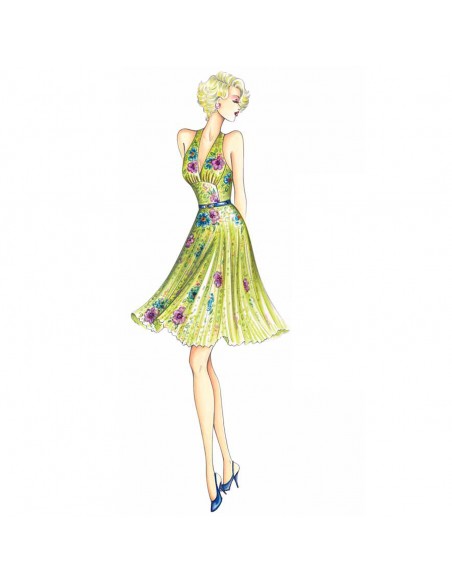 This dress brings to mind Marilyn and the 1950’s. The American-style bodice is gathered and knotted at the back of the collar, has a belted waist and a broad accordion-pleated skirt.