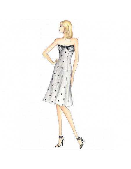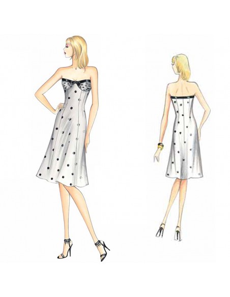 This form-fitting dress is made of panels which are flared at the bottom. It has a deep neckline, tightly draped cup motif and grosgrain or satin trim. Suggested fabric: crêpe, stretch satin.