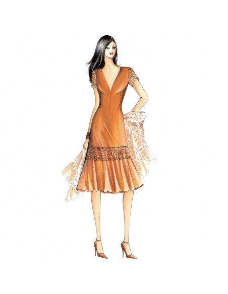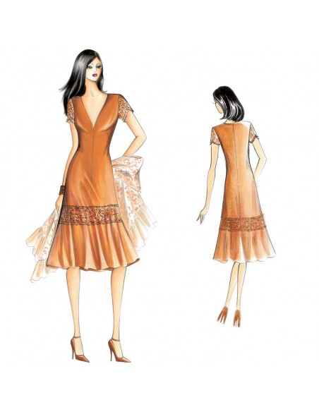 This somewhat form-fitting dress has short sleeves and inserts that adorn the ruffle on the skirt. Suggested fabric: cotton satin or cady, or muslin print with bell sleeves.