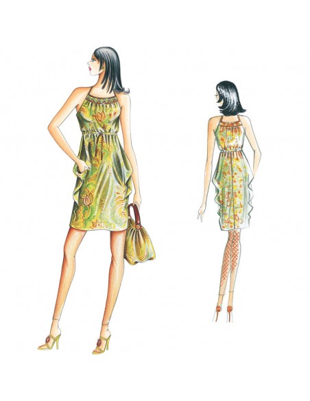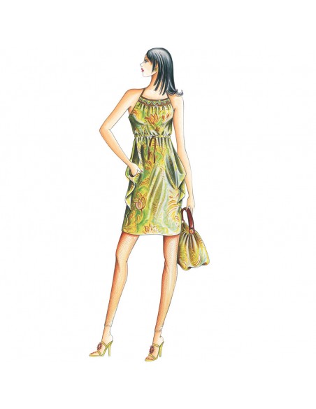 This dress has a raised waistline secured with drawstring and sheath skirt. Suggested fabric: cotton jersey or muslin.