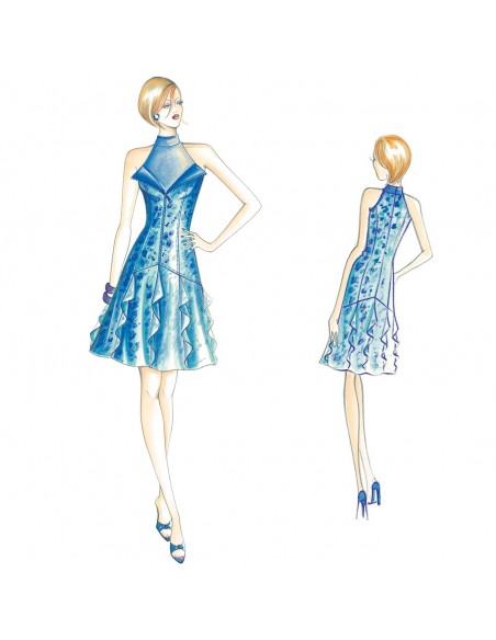 This form-fitting stylized corset dress has a central zipper that opens into overstitched lapels on the neckline. It has a high-neck bib and gored miniskirt divided into flared panels with vibrant ruffles inserted between them. Suggested fabric: taffeta, cotton muslin, linen or denim with chiffon ruffles and chiffon or tulle for the bib.