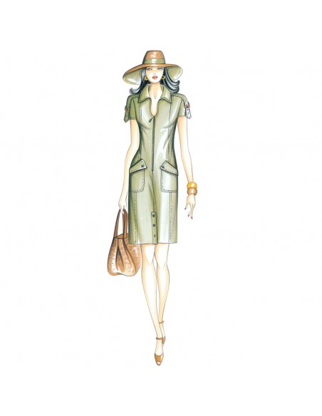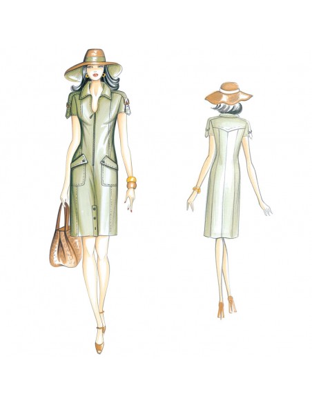 This sporty, straight, form-fitting dress closes with a central zipper. It has an open polo collar, strips with buckles crossing the shoulders and sleeves, patch pockets with oblique flaps and vents at the bottom closed with buttons. Suggested fabric: denim, gabardine, sallia, linen.