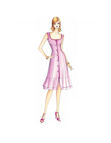 This elegant longuette dress has a wide neckline with gathers in the bodice, kimono sleeves and a flared skirt divided into four drapes. It can be made with or without empire cut.