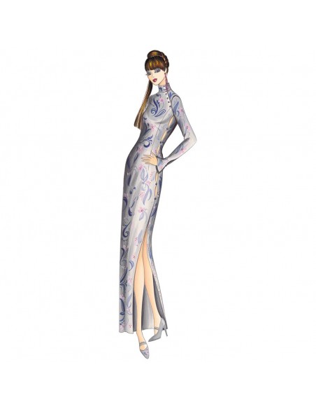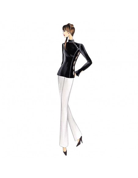 This straight form-fitting Peking-style dress is long and elegant. It has a slit opening along one side which his sealed by buttons and has a deep slit.The stand-up collar is closed on the diagonal and the flared cuffs have slits. Can also be made as a short, sleeveless dress or as a blouse. Suggested fabric: satin or jacquard print, damask, rayon jersey, cady.