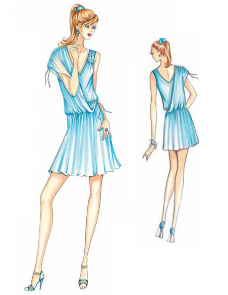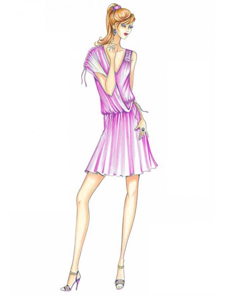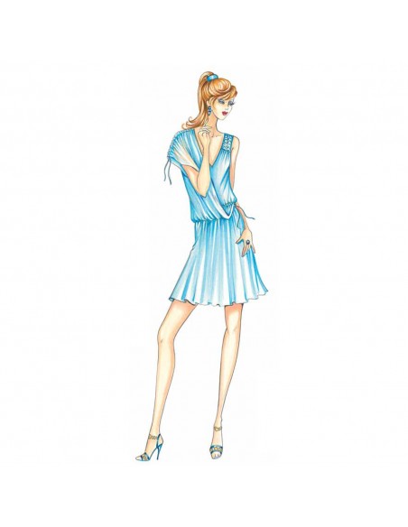 This short draped dress is reminiscent of the ancient Greek peplos. It has a drawstring at the waist and a long, loose shoulder panel inserted on one side. Can also be made without the panel. Suggested fabric: jersey, crépon.