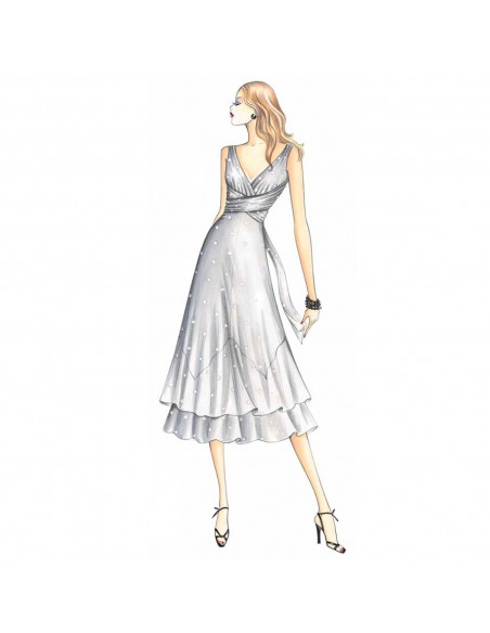 This dress has a crossed ribbon motif and draping on the tight-fitting bodice. The neckline is V-shaped at both front and back. The gored skirt has four panels cut on bias with point and double flounces at the bottom. Suggested fabric: jersey, muslin or voile.