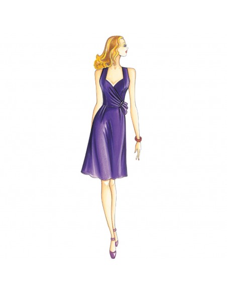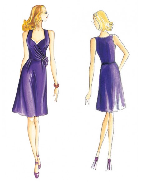 ‘50s-style dress with bodice featuring heart-shaped neckline, waistline featuring drape forming a bow, and godet skirt. Suggested fabric: light satin or crêpe de chine.