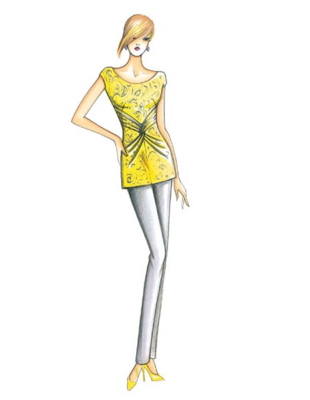 Fitted dress with flared hem and panels that cross at the waist to form an X-shaped drape and high split. Can be made as a blouse. Suggested fabric: jersey.
