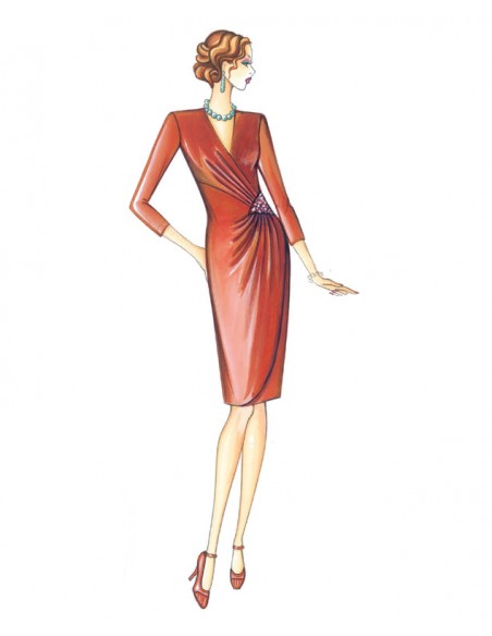 ’50s-style asymmetrical dress with lateral drape, V neck, and panel from the diagonal seam under the bust that is held at the waistline by an embroidered or sequinned triangle. Suggested fabric: crêpe or jersey.