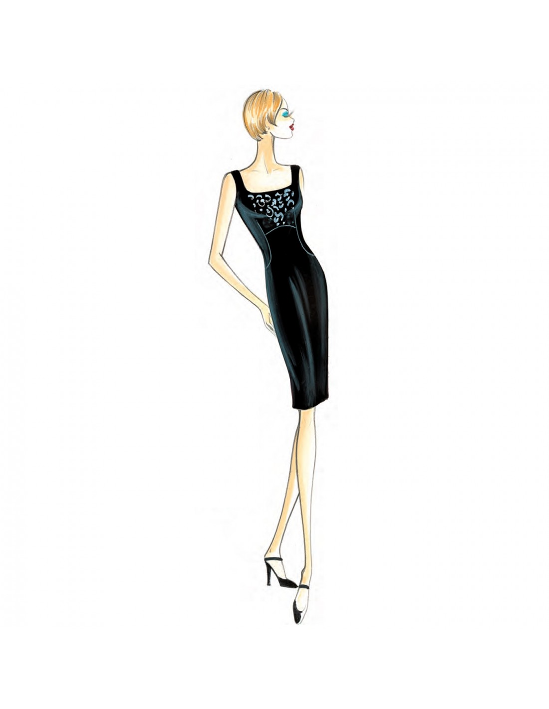 This dress has an empire line enhanced by embroidery or lace and square neck becoming V-neck on the back, marked by a string. Suggested in organdy, crêpe, sateen.