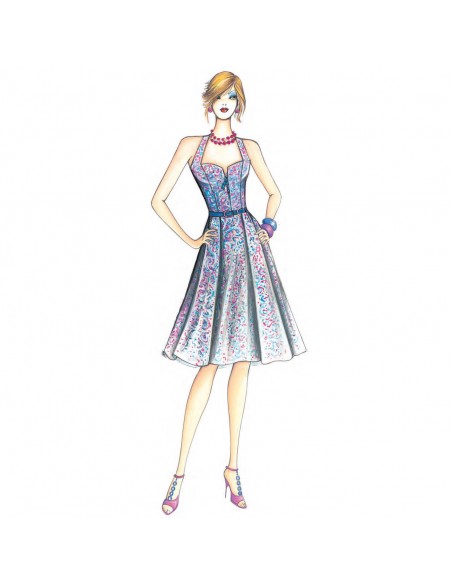 This ‘50s-style dress has a corset-style bodice and the skirt is divided into panels, it has a pocket inside the box pleat. Suggested fabric: sateen.