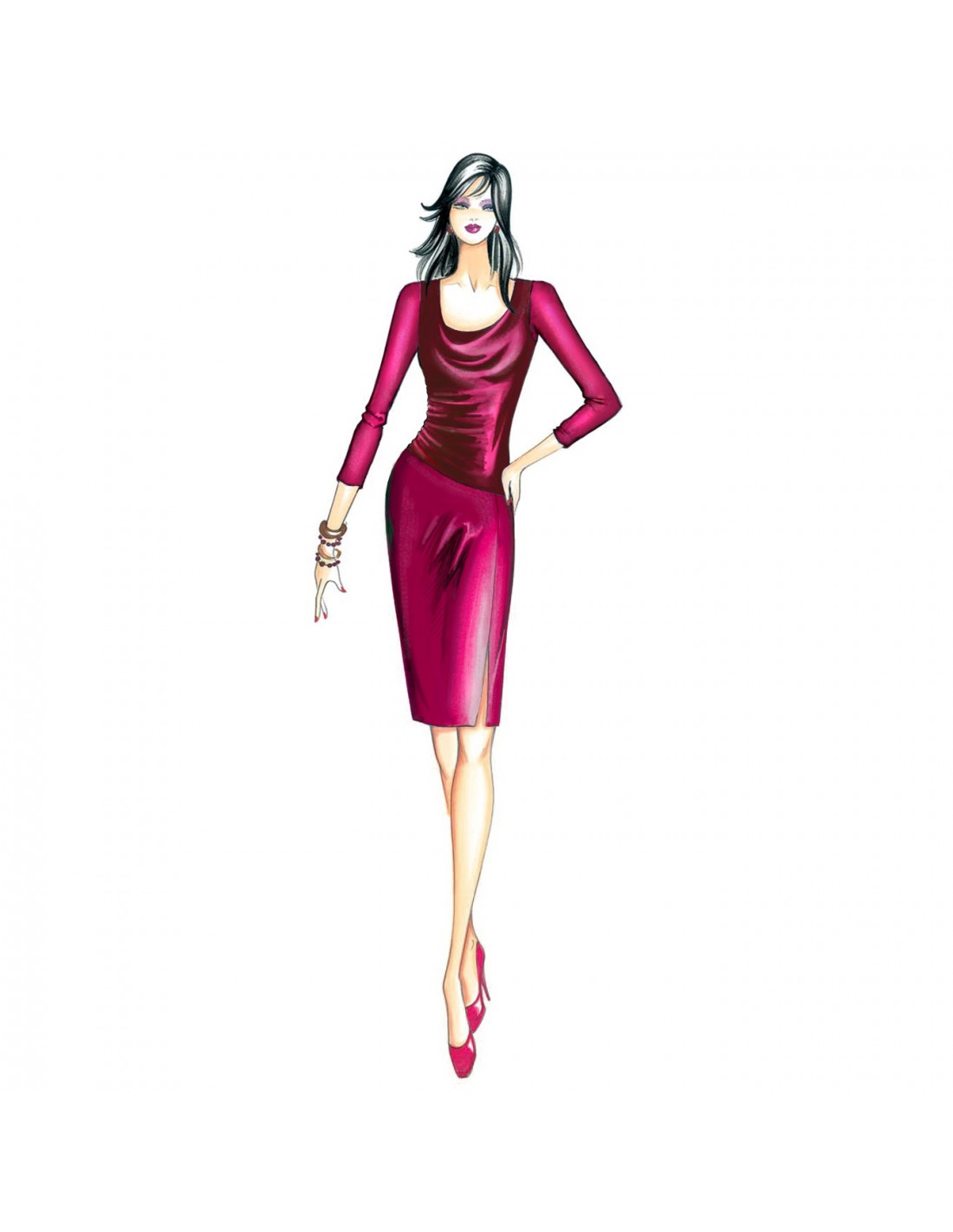 Form-fitting dress with asymmetrical bodice moved by a soft drape on one side and cowl neck, skirt with side slit and 3/4 sleeves. Can be made in various versions for both day and evening wear: entirely in jersey or crepe, with jersey bodice plus skirt and sleeves in sequined or spotted fabric, or sleeveless in faux leather.