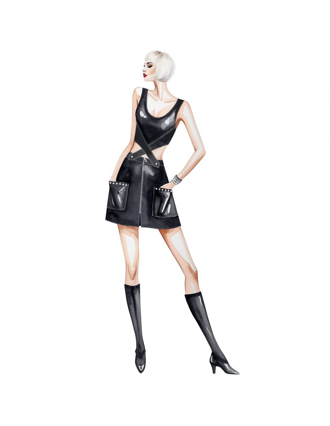 70s-inspired mini dress to be made in denim or faux leather, skirt with zip and bodice with criss-cross straps fastened with press studs.