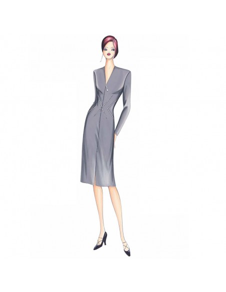 This form-fitting dress is closed by a long zipper. It has a V-neckline, slit at the bottom and original motif at the waistline with crossed darts and stitched triangular inserts. Suggested fabric: jersey, smooth velvet or crêpe.