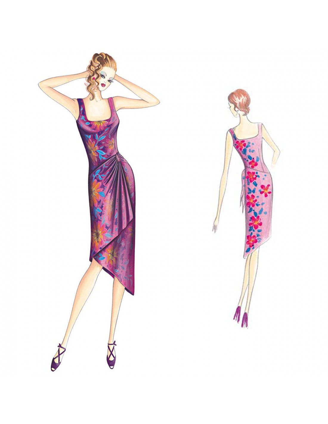 This form-fitting, sarong-like dress has a tank-top bodice and asymmetrical skirt with a diagonal hemline overlaid with a softly draped panel secured on the side by a ring or ribbon knot. Suggested fabric: rayon or cotton jersey, georgette or challis rayon.