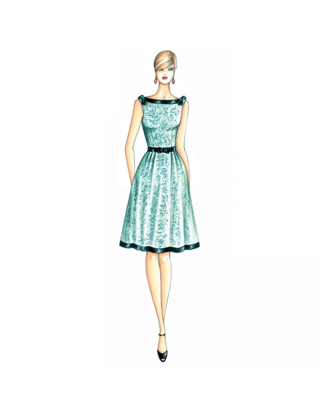 A romantic vintage flavour for this 1950s style dress with fitted bodice, boat-neck front and V-neck back, ribbon trim on neckline, ribbon belt, and flared skirt with pleats at the waist. to be made with or without sleeves. Can be made in Sangallo lace, printed satinette, or piqué with organza or satin trim.
