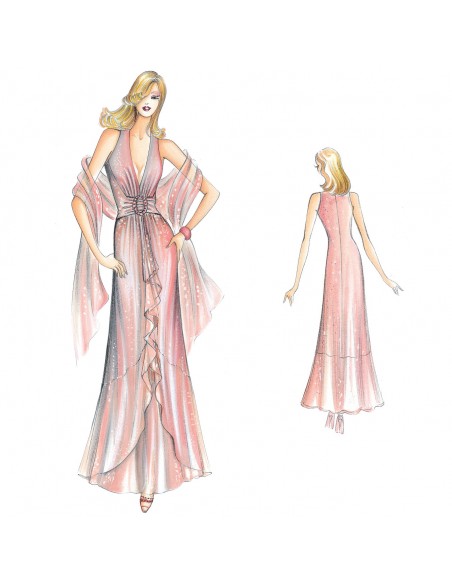 This evening dress has a waistline marked with a waistband secured by a strass clasp. The skirt is softened by a volant. Suggested fabric: chiffon or lamé silk jersey.