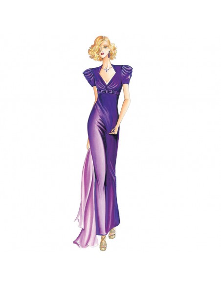 This evening gown has a sweetheart neckline and ribbon marking the empire waistline. The sleeves are gathered. Suggested fabric: satin or velvet.