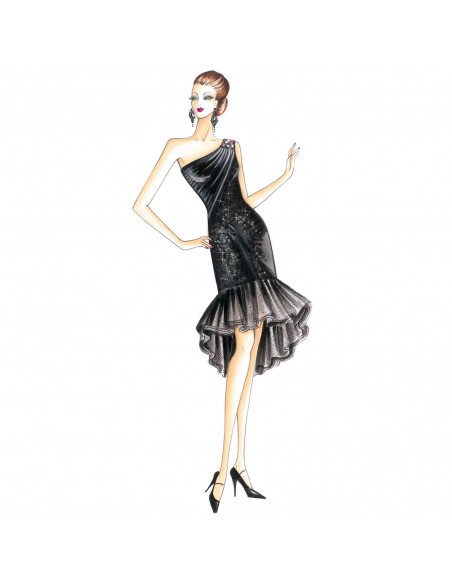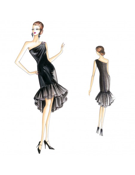 One-shoulder gown of molded line with draped panel inserted diagonally over the bodice and stopped at the shoulder by embroidery with stones and rhinestones, the skirt opens at the bottom in multiple tulle ruffles that flow down the back. Can be made in duchesse satin, plain velvet, cady or sequined fabric.