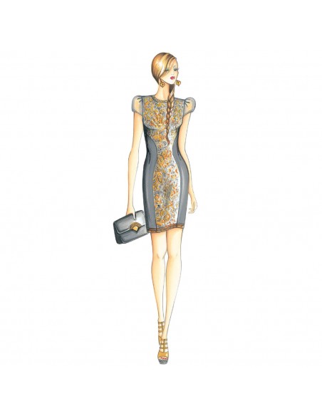 Mini-dress with amphora cuts that hug the figure. Suggested fabric: velvet and lace or satin and patterned fabric.