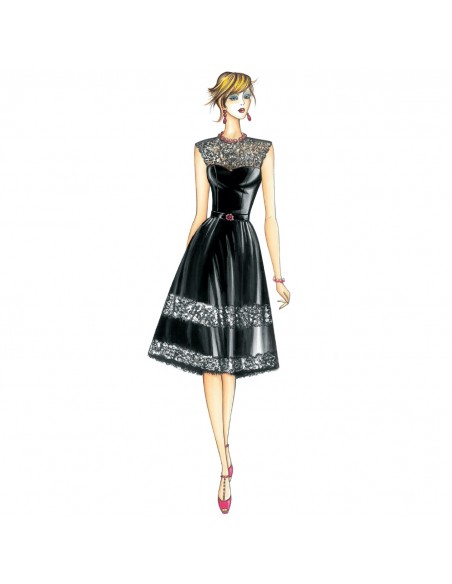 ’50s style dress with fitted corset-style bodice, high-necked yoke, and godet skirt with slightly gathered waistline. Suggested fabric: satinette, pique or faille, with lace or organza yoke and matching inserts in the skirt.