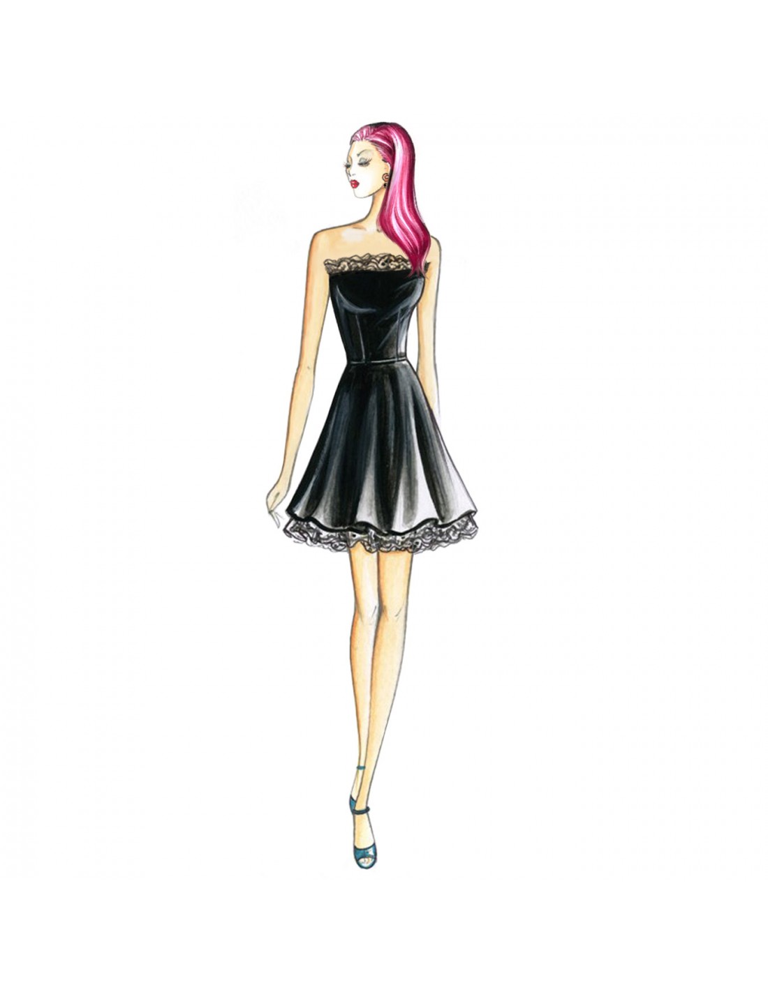 Delicate ruffles run along the hemline and neckline in the mini dress with bustier bodice and godet skirt with petticoat. Suggested fabrics: crepe, taffeta or duchesse satin with Chantilly lace edging.