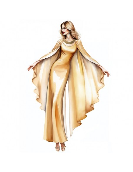 Trendy '70s atmospheres for the elegant long dress with a semi-fitted line and flared at the bottom with a plain cape that falls pointed at the back leaving a high central opening. Rounded neckline with rhinestone trim and cut-out opening. To be made in evanescent voile or ultra-light lurex jersey.