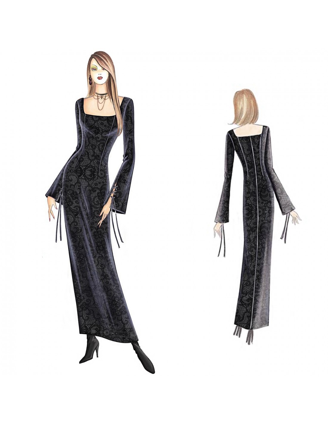 This long, form–fitting dress has a square neckline and sleeves which are flared at the cuffs. The dress has slits closed with crossed strings. Suggested fabric: lace, satin or velvet. Can also be made in a mini version.