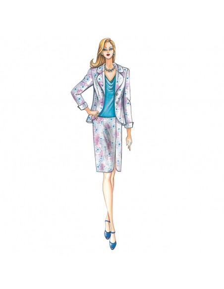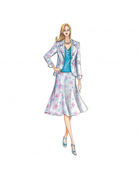 This single-breasted, slightly loose-fitting jacket has a rounded collar and lapels, and 3/4 sleeves. Suggested fabric: satin or cotton print. Top n. 1808. Gored skirt with six panels n. 5094. Straight skirt n. 2970.