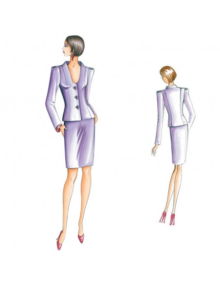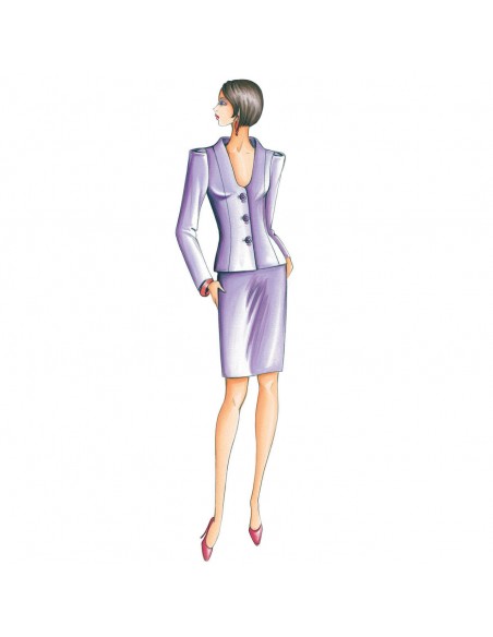 This modern jacket has chalice-shaped sleeves and an off-set, raised collar. Suggested fabric: shantung, linen, satin and brocade.