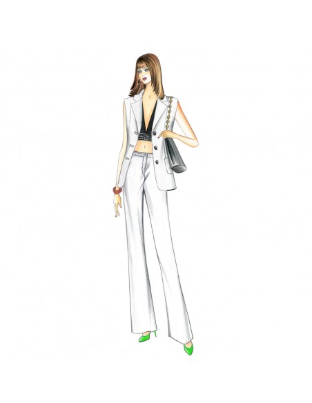 This somewhat form-fitting single-breasted jacket has a sporty collar and inset pockets with flaps. Can also be made sleeveless. Suggested fabric: crêpe, light-weight wool or shantung. Top n. 7135. Skirt n. 6901.