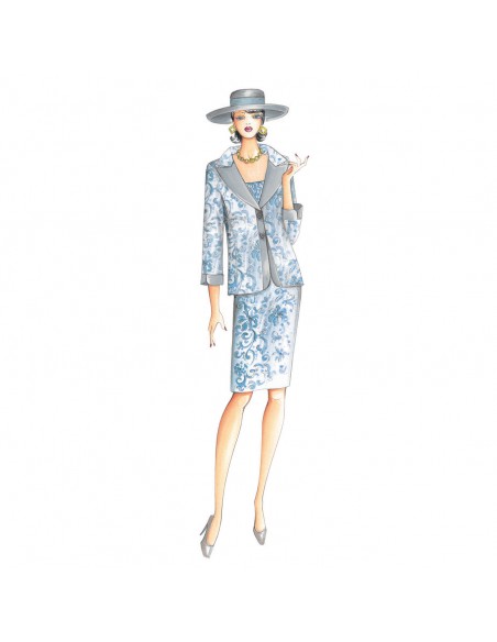The collar of this relatively straight jacket has raised points that are one with the placket. The jacket closes with two buttons. Suggested fabric: two-tone fabric.