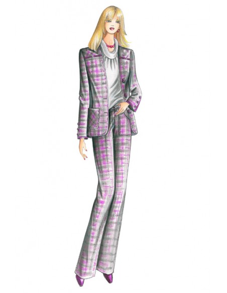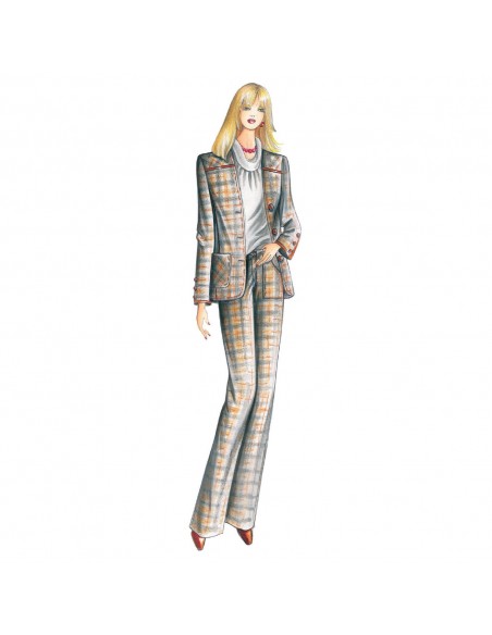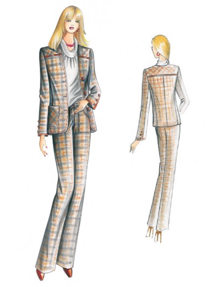 This relatively straight jacket has a V neckline, yoke, cuffs and glossy leather buttons. Suggested fabric: wool plaid.