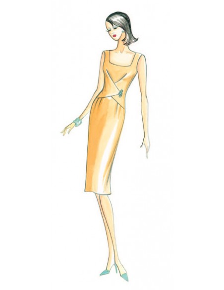 Mt. 1,40 alt. 1,40. This dress has a crossed motif at the bodice that forms soft pleats held by a pin toward the hip.