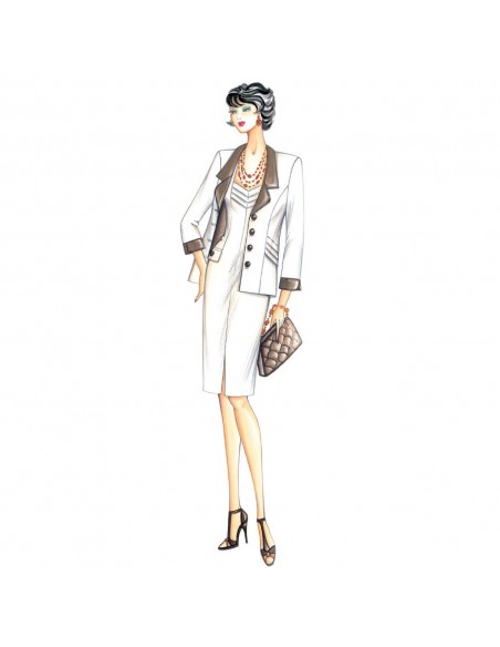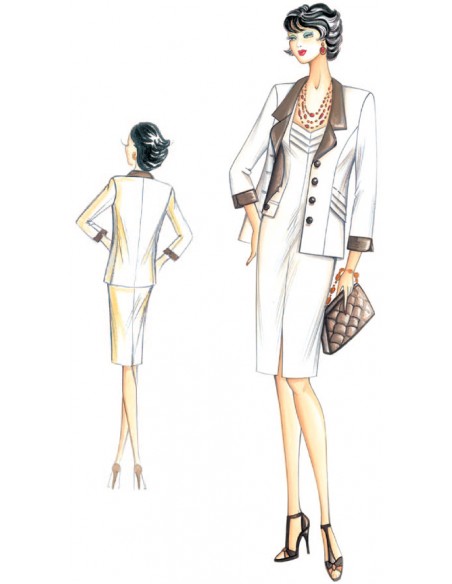 Mt. 1,70 alt. 1,40. This somewhat form-fitting jacket has a V-shaped pleat motif at the hip; the collar has rounded lapels like the cuffs of the ¾ sleeves.To combine with the dress 2733.