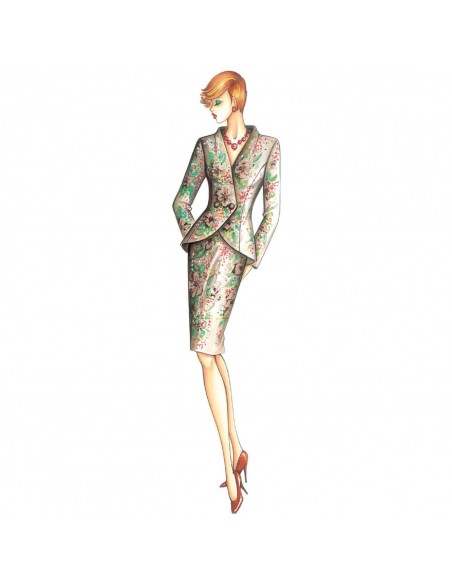 Architectural lines for this fitted redingote-style jacket with loose rounded hem, raised collar falling to a V and double crossover fastening detail. Can be made in damask weave, duchesse satin, faille, quilted dobby or Mikado silk.