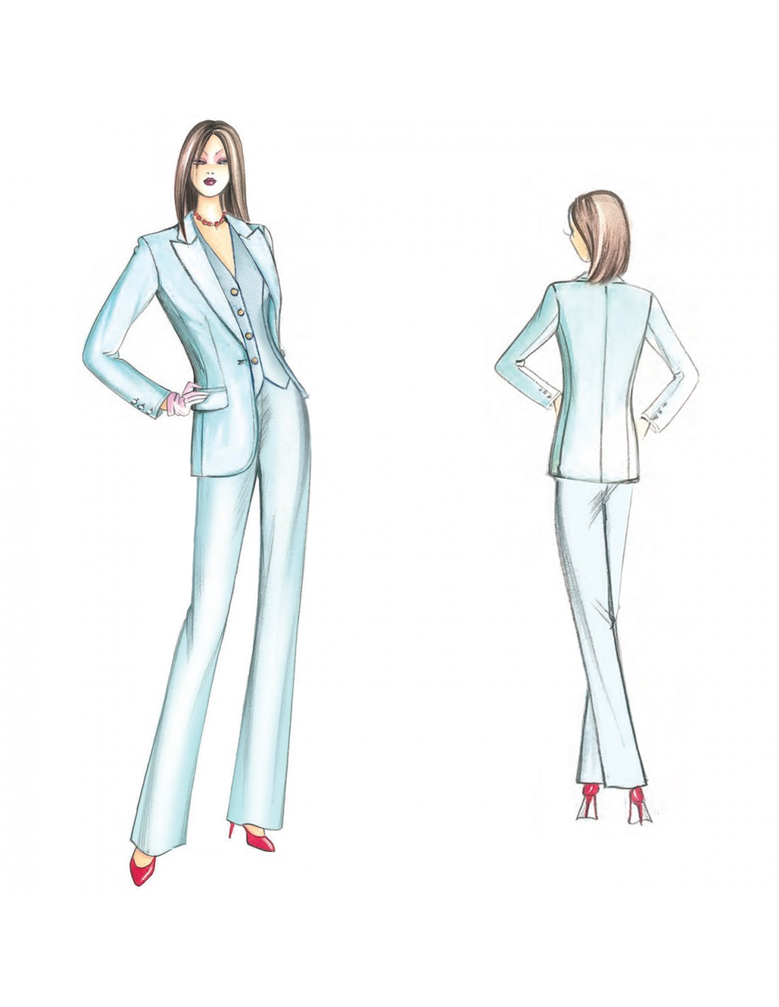 This men’s style, single-breasted jacket has a collar with pointed lapels, flaps and a rounded hem. Suggested fabric: crêpe, summer-weight wool, pinstripe fabric. Vest n. 5353.