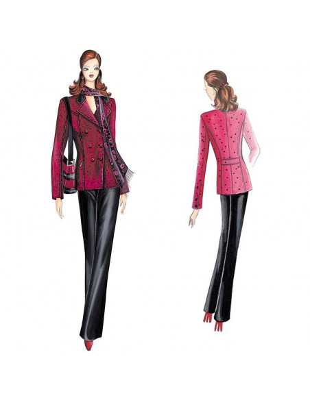 This somewhat form-fitting, double-breasted jacket has a cross-over that descends into a singlebreasted cut and closes with a zipper. It has a leather over-collar and yoke at the back.