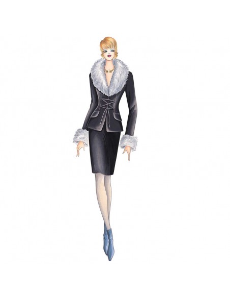 This youthful, trendy form-fitting jacket is closed with crossed strings that pass through frogs. It has a broad shawl-like collar and fur cuffs.