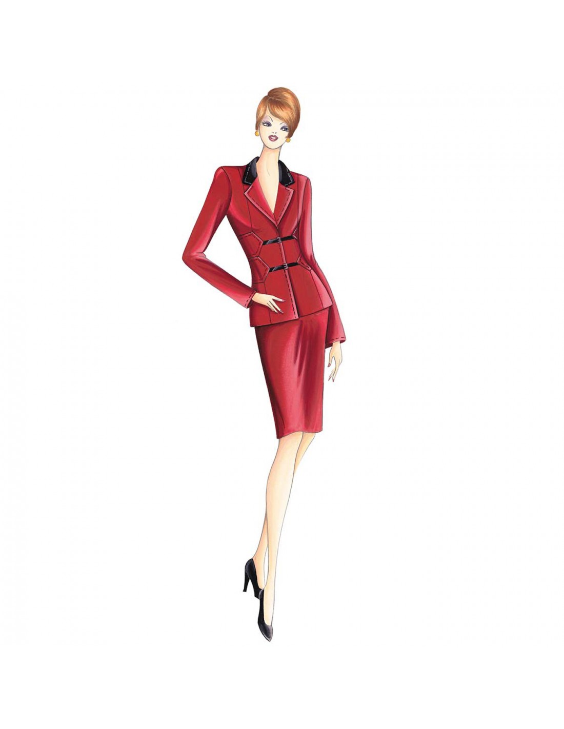 This 1970’s-style single-breasted, form-fitting jacket has a shaped band motif that holds two leather strips as an over collar. It is closed with buckles. Suggested fabric: crêpe or light wool, tweed, gabardine or felt.