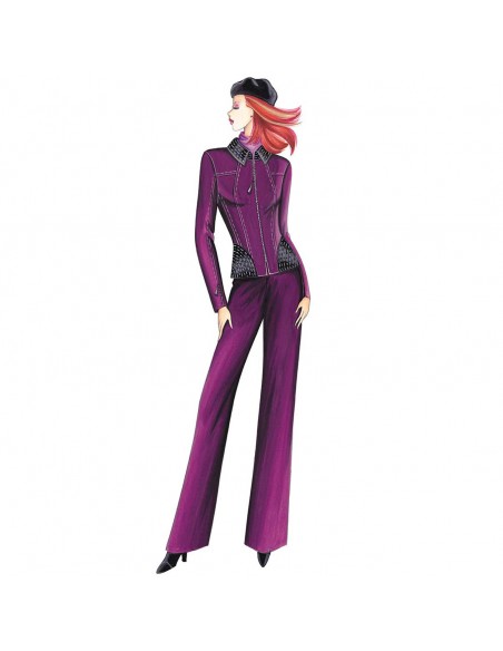 This sporty, form-fitting blouse closes edge-toedge with a zipper. It has shaped cuts, sleeves cut at the front and opening at the cuffs. It has a wide waistband which is rounded at the front and descends into a point at the back. It has a tightly overstitched shirt-like collar. Suggested fabric: felt, vicuna or denim alternated with leather or entirely of leather.