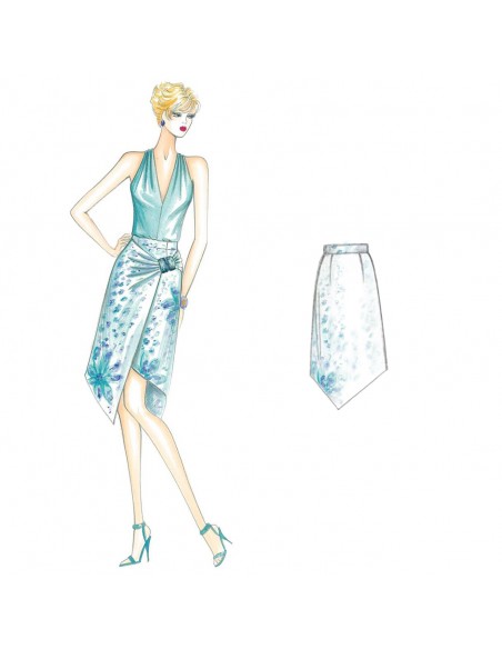 Outfit with top and gored skirt made of crossed panels with draping secured at the hips with a gem buckle. The asymmetrical hemline drops to a point both front and back. Suggested fabric: viscose, crêpe, satin.