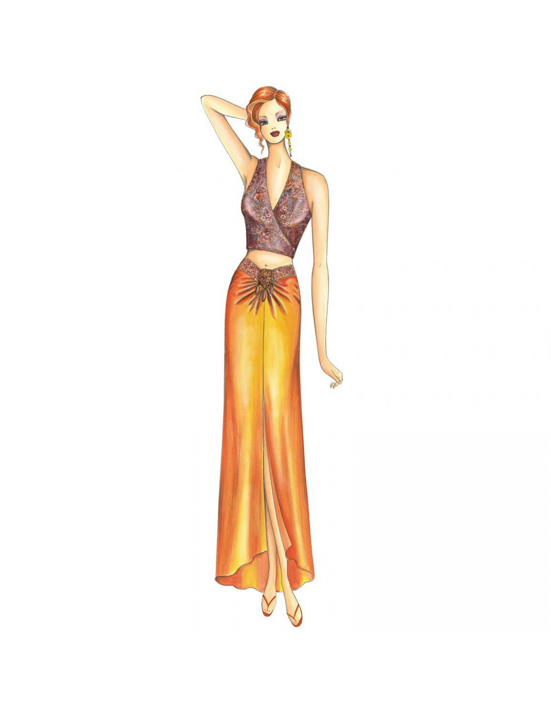 Beach wear outfit to be made in voile, jersey or taffetas. Crop top knotted in the back and low-waisted pareo skirt with drape sealed by rhinestone appliqués and slit in the center.