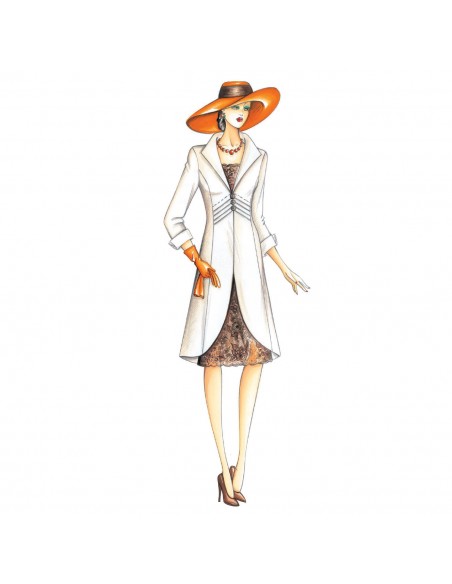 Redingote-line coat with raised pointed collar, waistline with small pin-tuck motif, edge-to-edge button fastening and slanted buttonholes, and sleeves with turn-up cuffs. Suggested fabric: crêpe, satin or summer-weight wool.