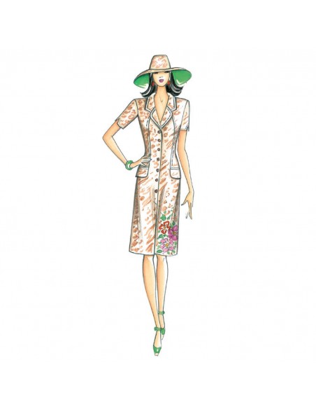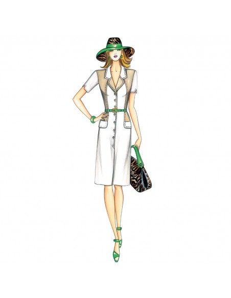 Blouse with rounded lapels, short sleeves with V split, belt at waist, and pocket flaps over inset pockets. Suggested fabric: two-tone or printed fabric.