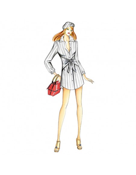 Semi-fitted shirt with knotted sash at waist and rounded hem, to ba also made as a mini shirt-dress.