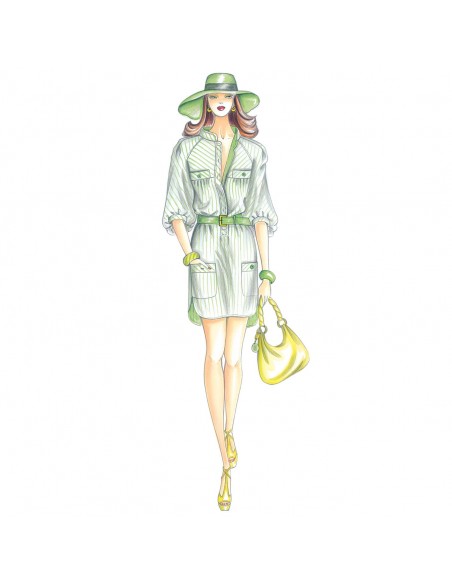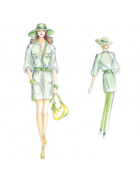 This maxi blouse, which can also be worn as a minidress, has a broad offset mandarin collar and closes polo style. The raglan sleeves have darts at the shoulders and gathers at the elbows. It has both inset and patch pockets, side slits and a belted waist. Suggested fabric: batiste or muslin.