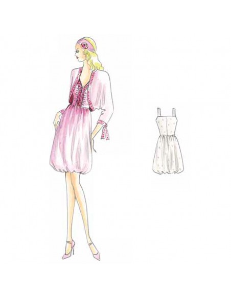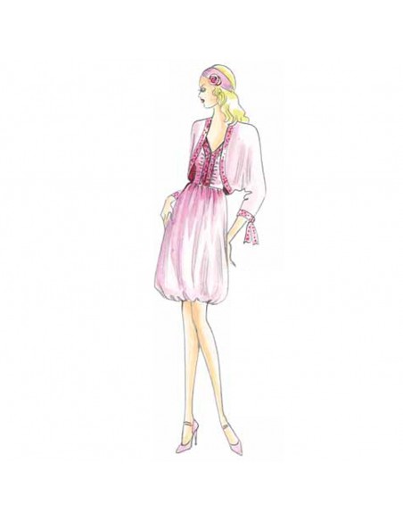 The edge of this shrug descends to a point at the waistline. It has 3/4 kimono sleeves with knotted cuffs. Suggested fabric: knit or chiffon. Dress n. 1766.